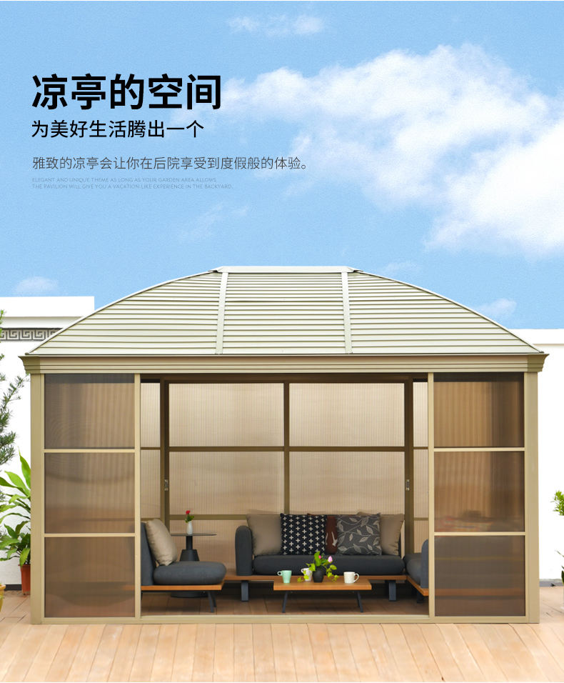 Beautiful hard metal top instead of normal fabric or polycarbonate material. Perfect choice for family and friend meetings, dinner parties and wedding ceremonies. Compare to a traditional soft top, this kind of roof is strong enough to withhold any heavy snow and offer unbeatable stability in windy conditions.